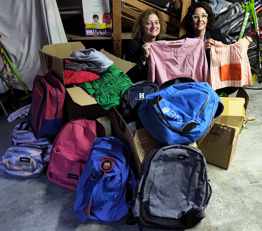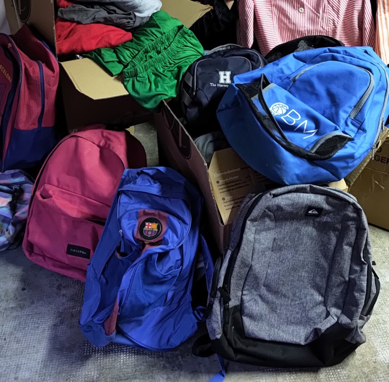 Avui dimecres dia 22 d’octubre, el Ton Toset i la Montse Torras, membres de la Junta de l’ONG Mans Mercedàries hem anat a casa de la Laura Amat i ens han fet donació de 12 caixes plenes de motxilles, xandalls, pantalons d’esport, samarretes, bates, pitets de bebè i dessuadores de l’Empresa Tute & Zaini de la Montse Fonollà; i també motxilles i material esportiu de la Laura Amat i de la seva família; i polos de màniga curta que ens ha portat el Rafa González.