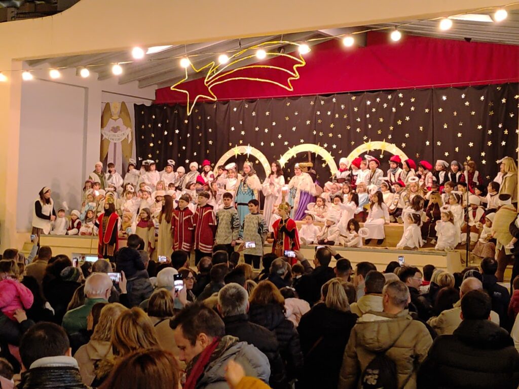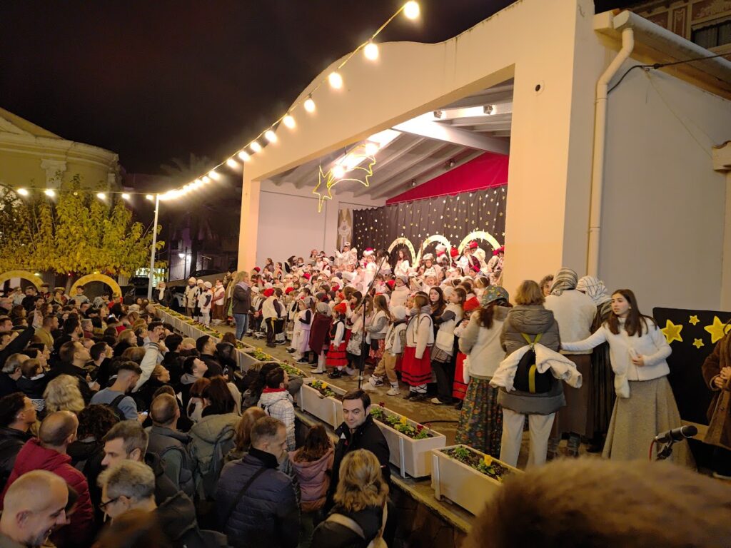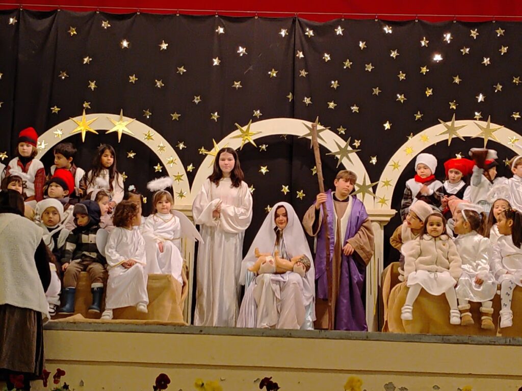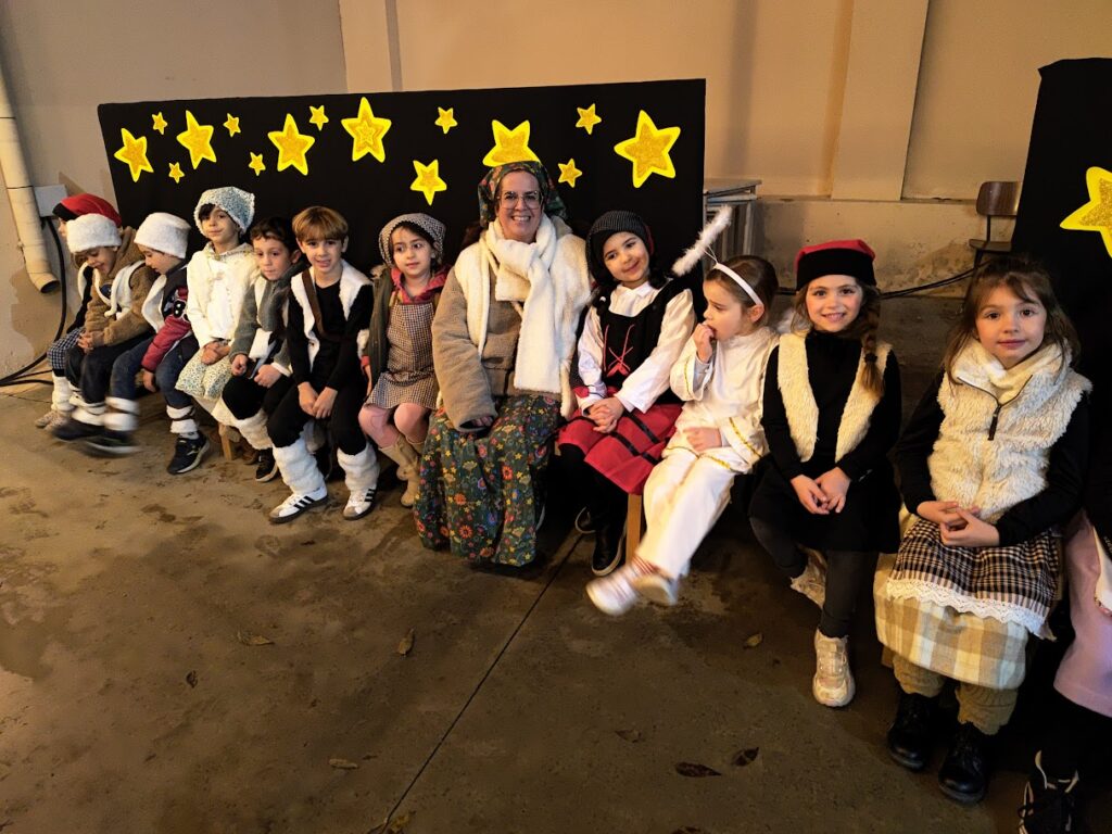 Després de l’entrada dels Mags d’Orient per anar a adorar el nen Jesús, tots els angelets, pastors i pastores i figurants del Pessebre Vivent i tot el Públic; s’han aplegat davant de la cova per cantar les nadales al Nen Jesús. Els/les alumnes han cantat 4 nadales, i s’ha acabat aquest concert cantant juntament amb el públic “El 25 de Desembre FUM, FUM, FUM”.