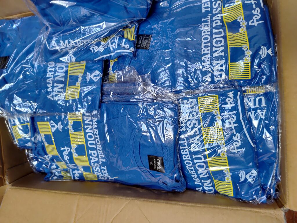 Hem rebut 5 caixes de roba esportiva: samarretes del Passeig de Catalunya, samarretes de la ViaOberta, samarretes de la Caminada de la Primavera, bosses de la Setmana Europea de la Mobilitat, bosses de Fem Esport Fem Salut i Clauers de Martorell. Tota aquesta gran quantitat de material serà transportat a Cooperació de Martorell, el local que l’Ajuntament de Martorell ens cedeix per poder guardar els Equipatges Solidaris de l’ONG Mans Mercedàries i tot el nostre Material Solidari.