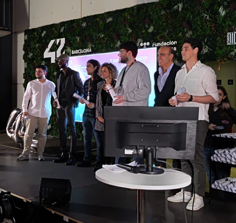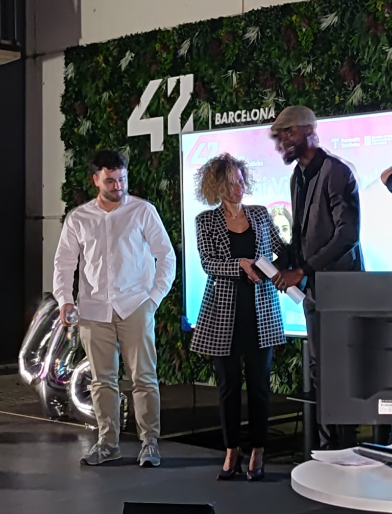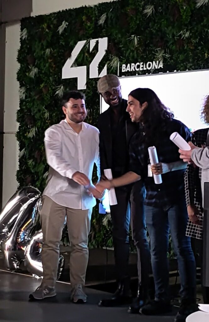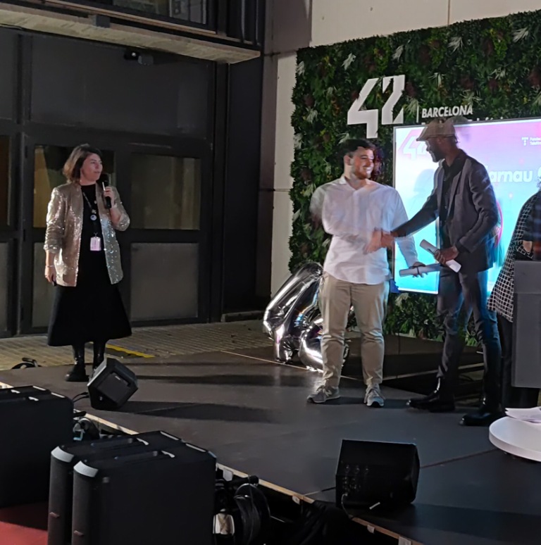 Ha començat el moment del lliurament de titulacions. Els/les alumnes han anat sortint a mesura que els nomenaven i rebien el seu títol de 42 Barcelona que els acreditava en el seus estudis i programes d’informàtica.