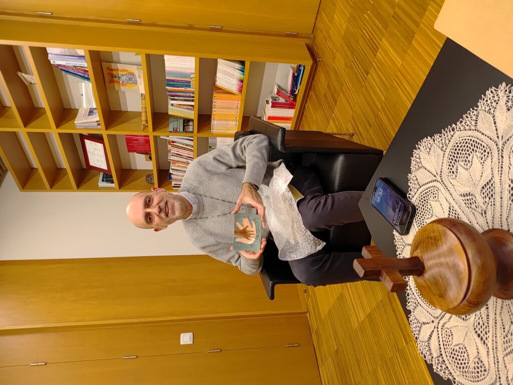 Un cop acabada la visita el Ton Toset i la Montse Torres han fet com a regal d’agraïment al Bisbe Xabier, la plata de ceràmica amb les Mans Mercedàries, com a record de la trobada del dia d’avui, que el Sr Bisbe ha col·locat en un dels prestatges de la sala.
